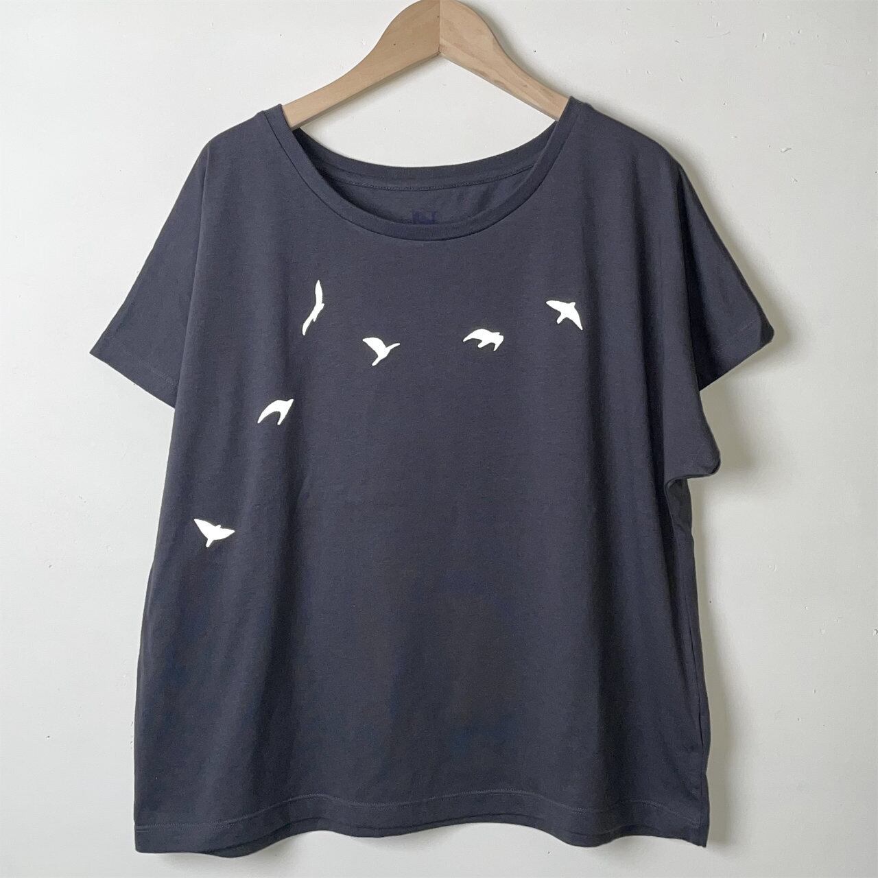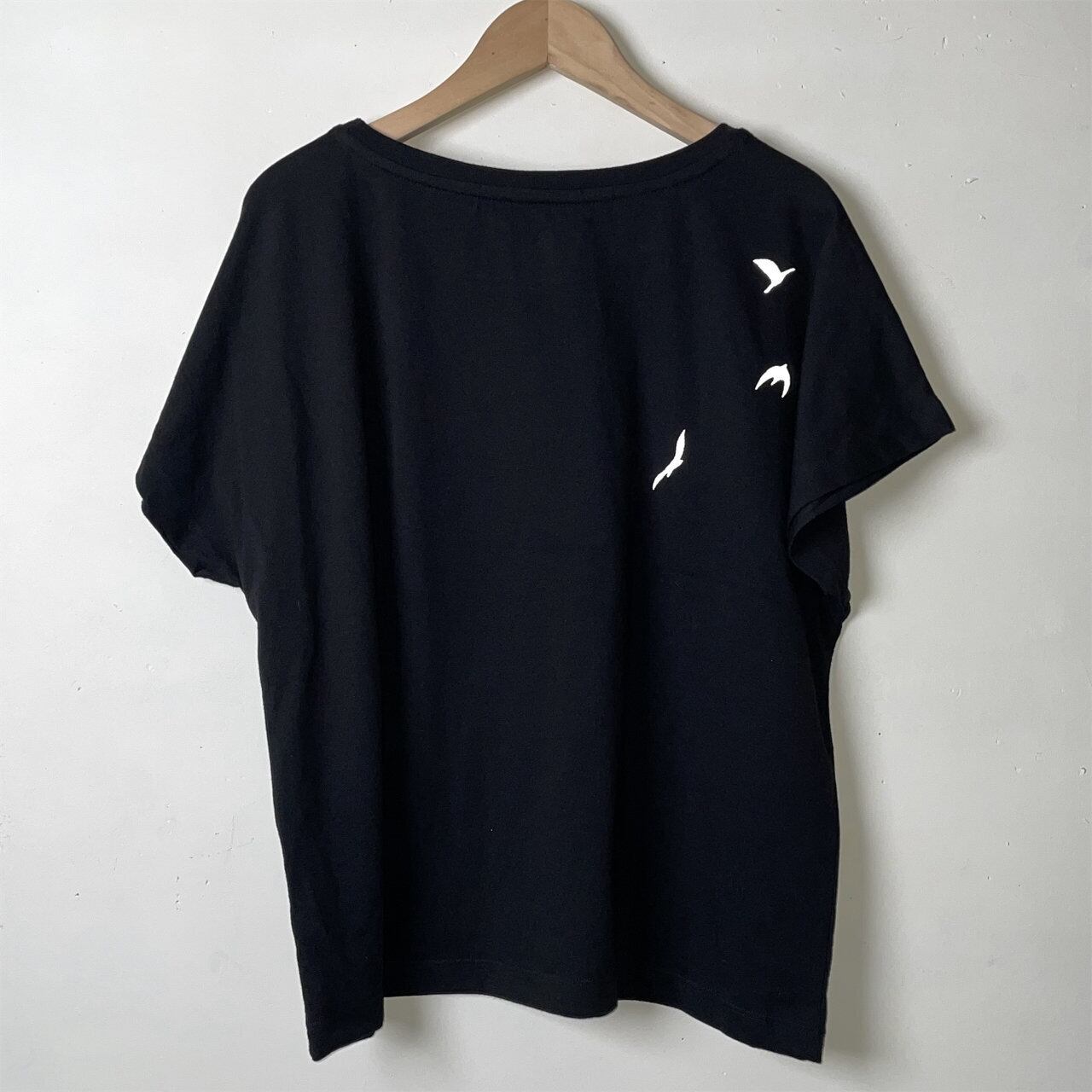 前面に6羽の鳥、背中に3羽を反射する白インクでシルクスクリーンプリント。