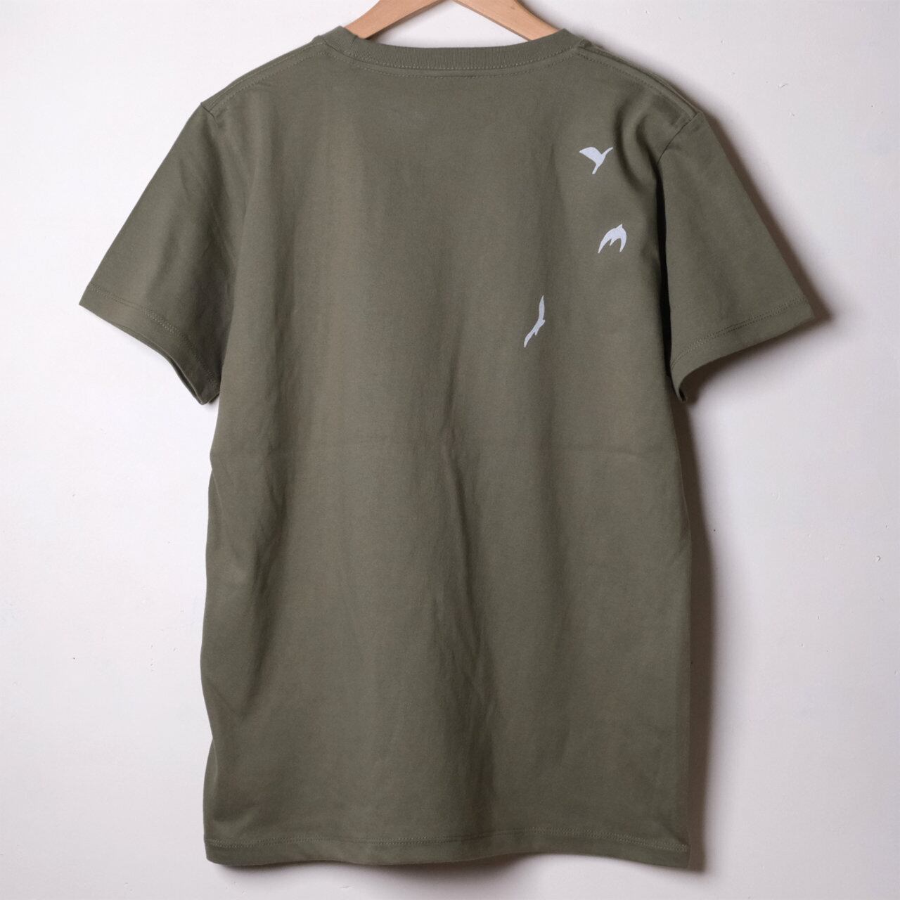 前面に6羽の鳥、背中に3羽を反射する白インクでシルクスクリーンプリント。