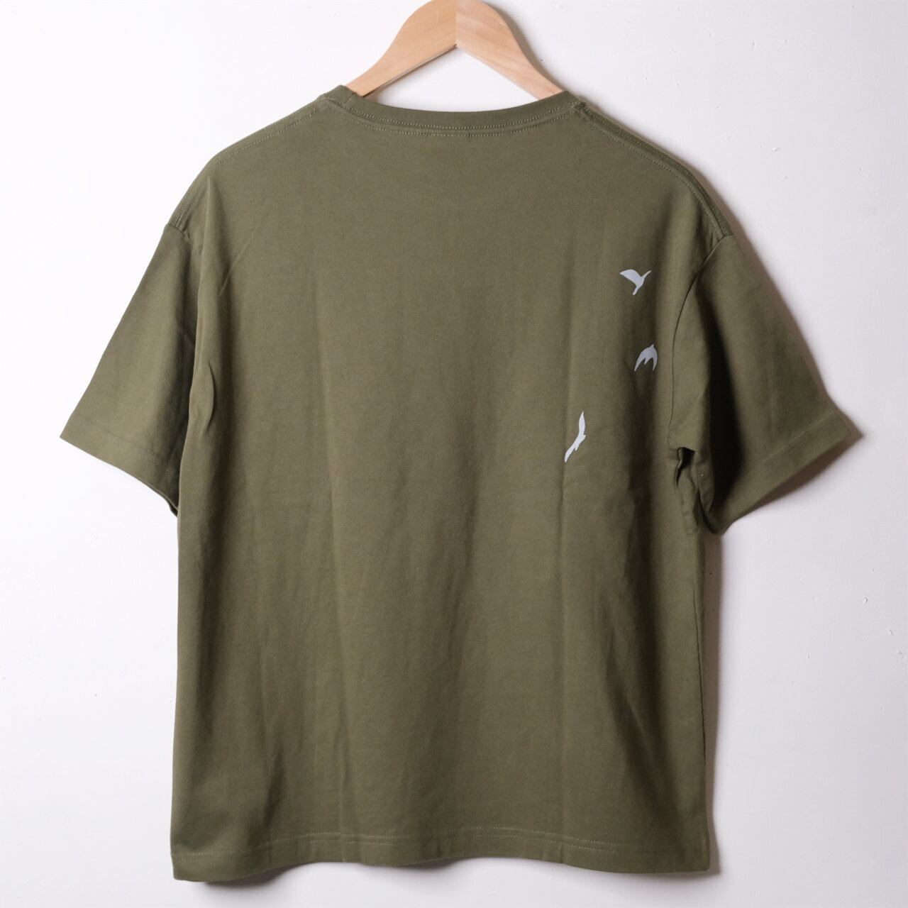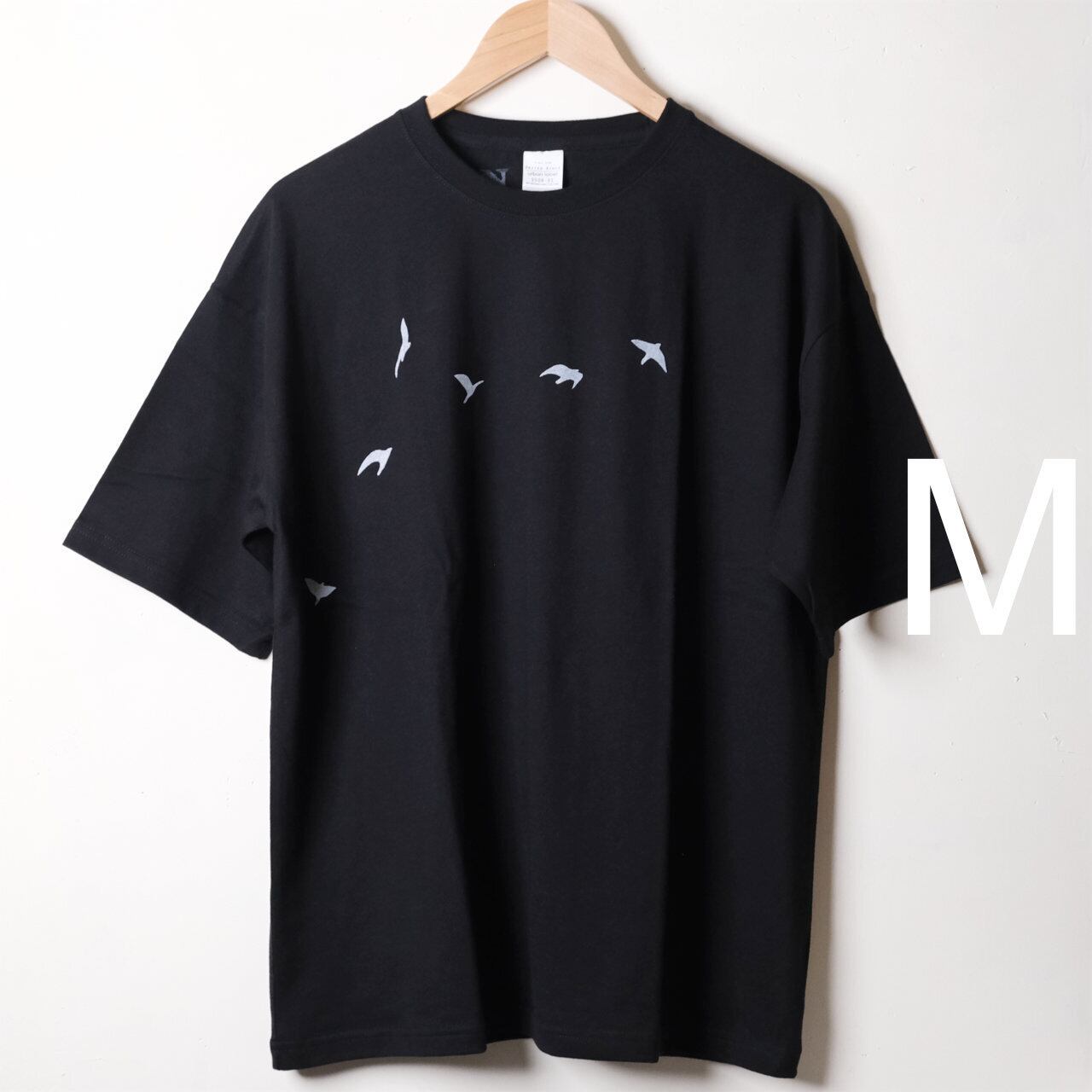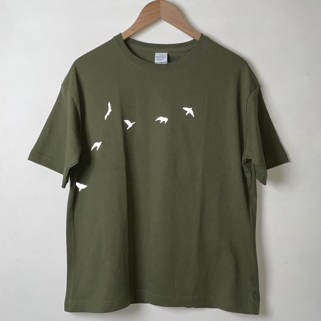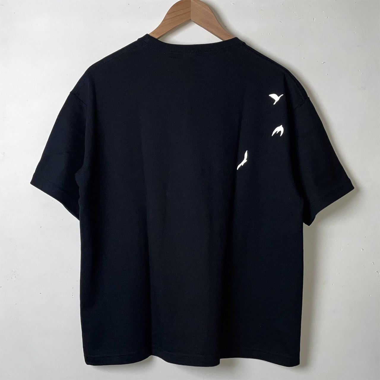 前面に6羽の鳥、背中に3羽を反射する白色のインクでシルクスクリーンプリント。