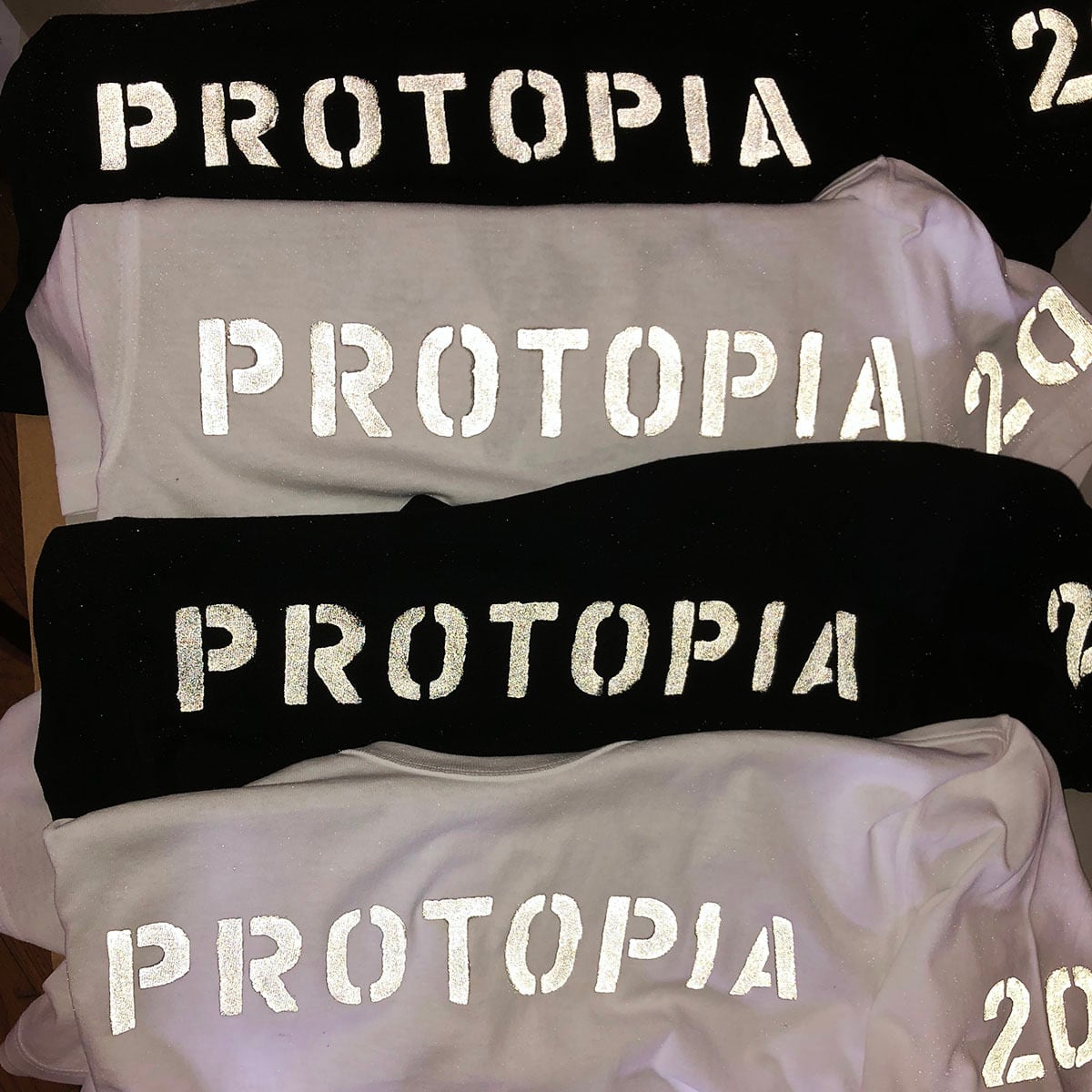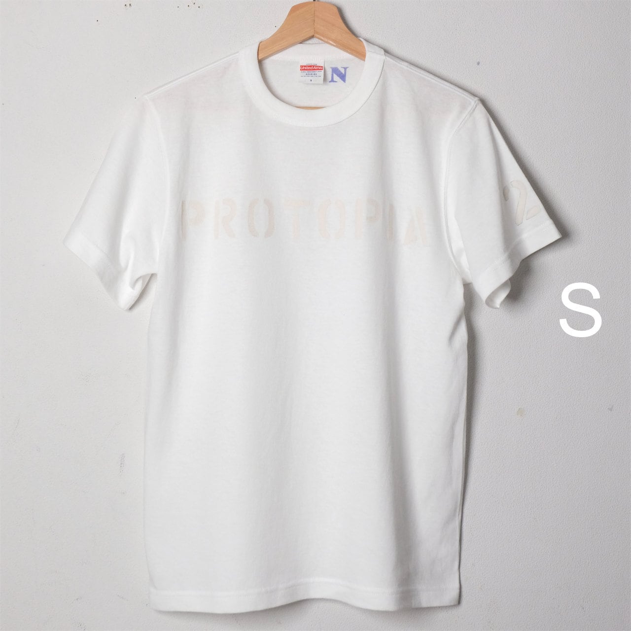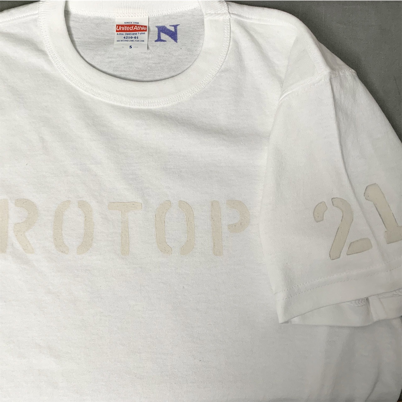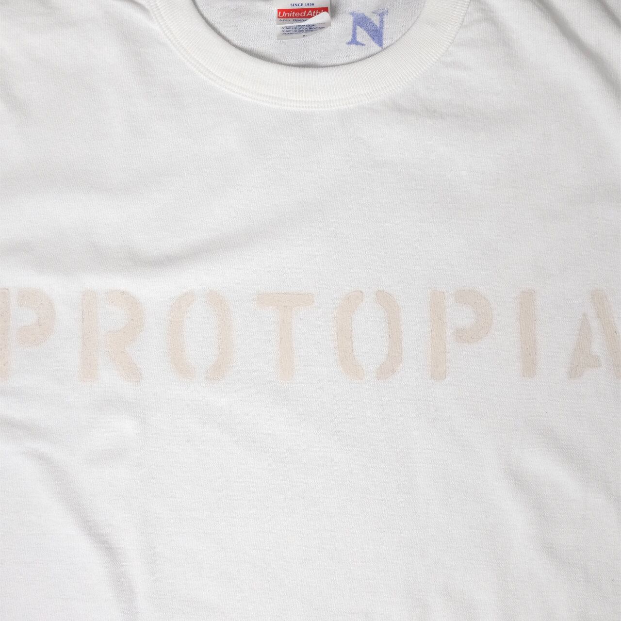 長年愛用しているアメリカ製のステンシルで *PROTOPIA 、左袖に 20 or 21 をペイント。白 x 白のS、Lは21。
