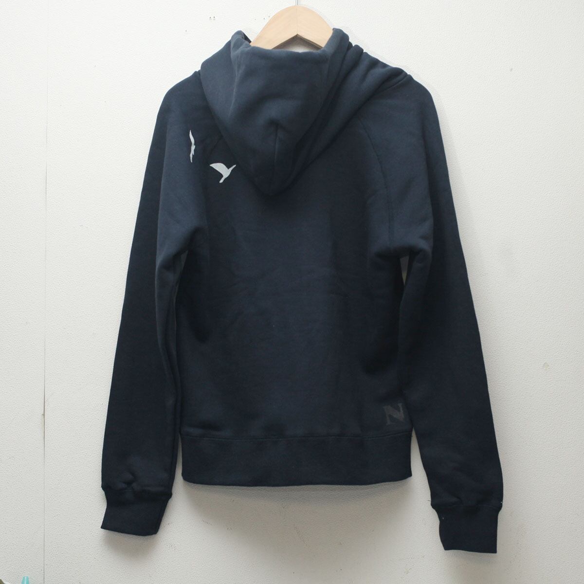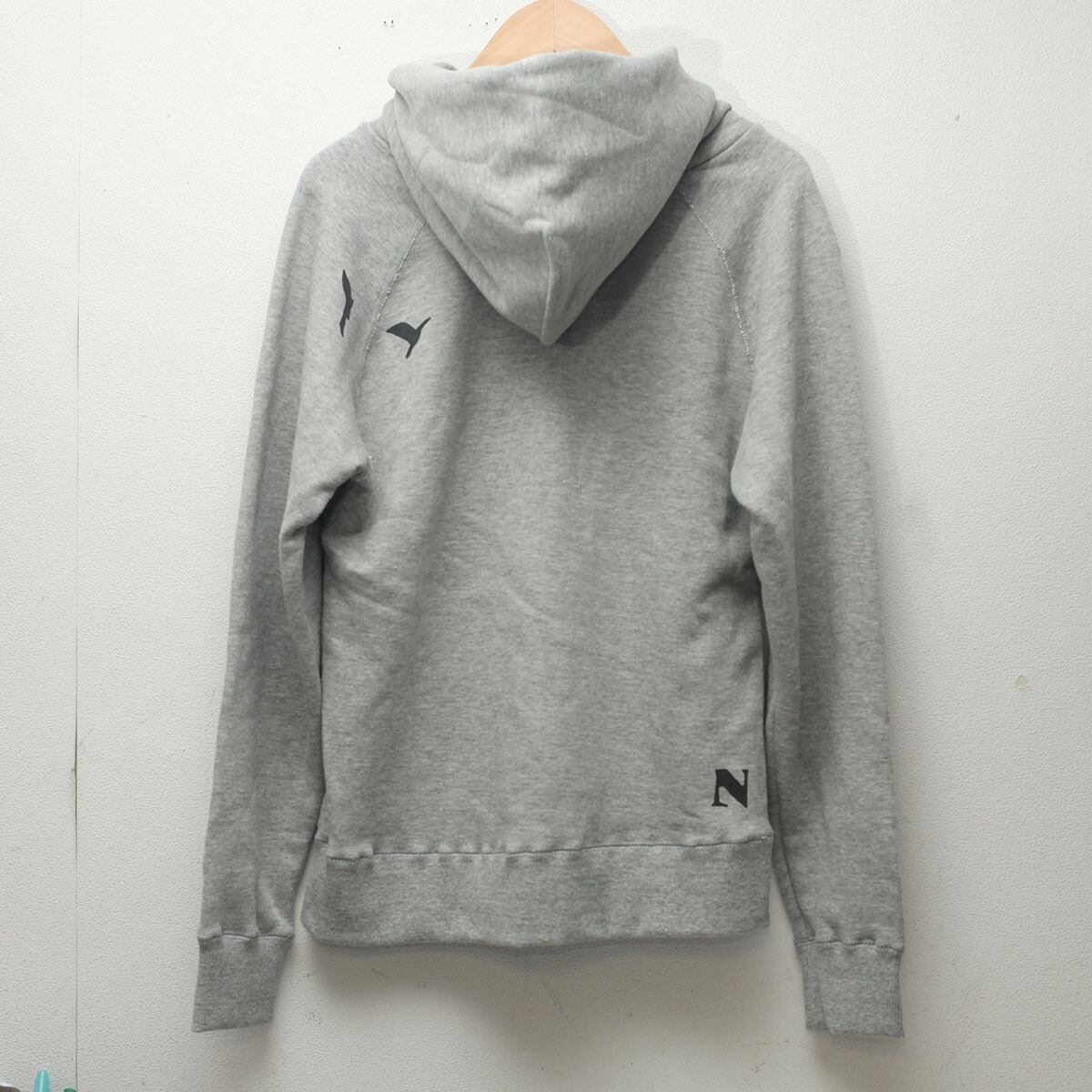 demimoon社のトレーナーに反射するインクで前面に1羽、後ろ面に2羽の鳥、右下にNマークをシルクスクリーンプリント。