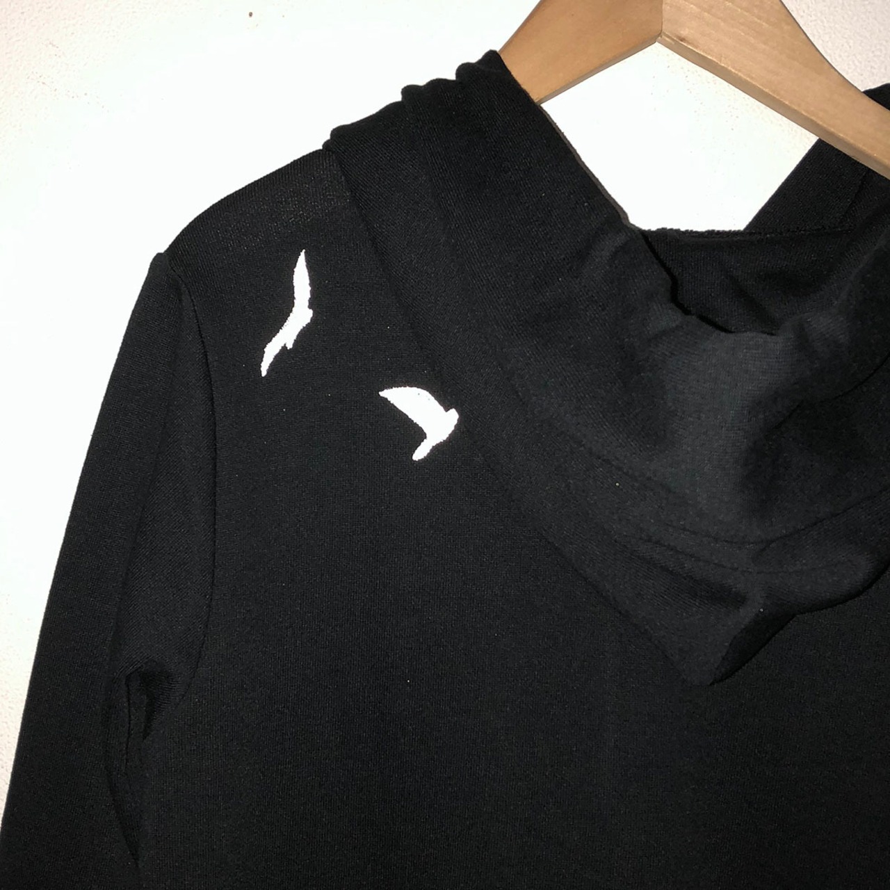 DALUC社 DM206 のパーカーに反射するインクで前面に1羽、後ろ面に2羽の鳥、右下にNマークをシルクスクリーンプリント。