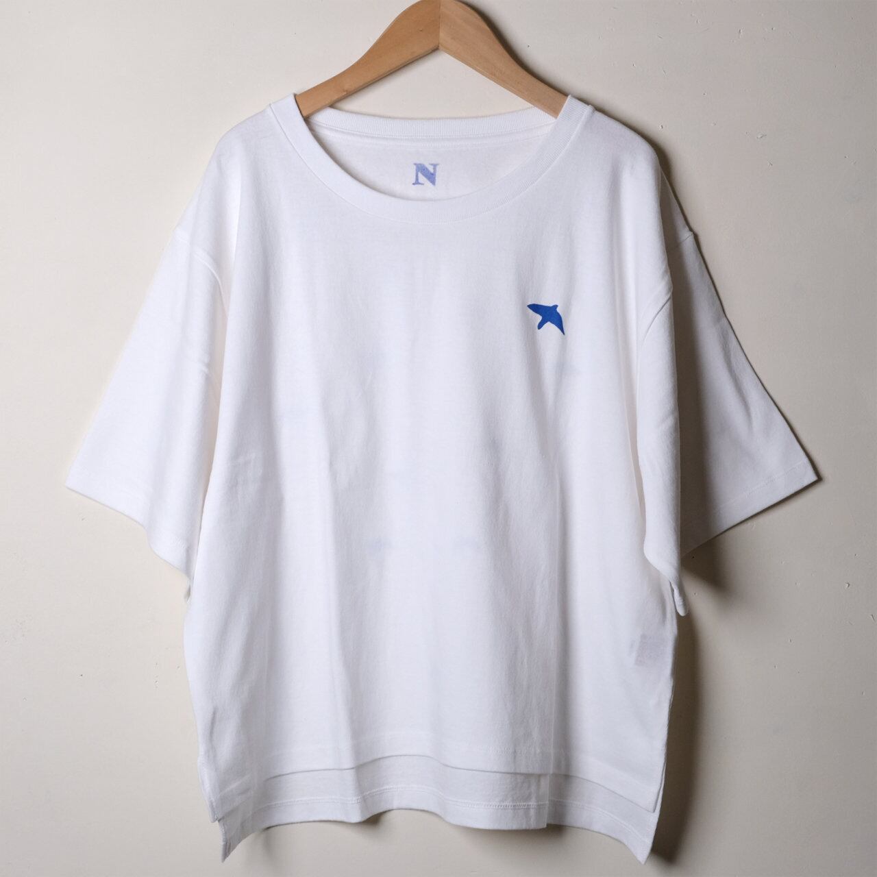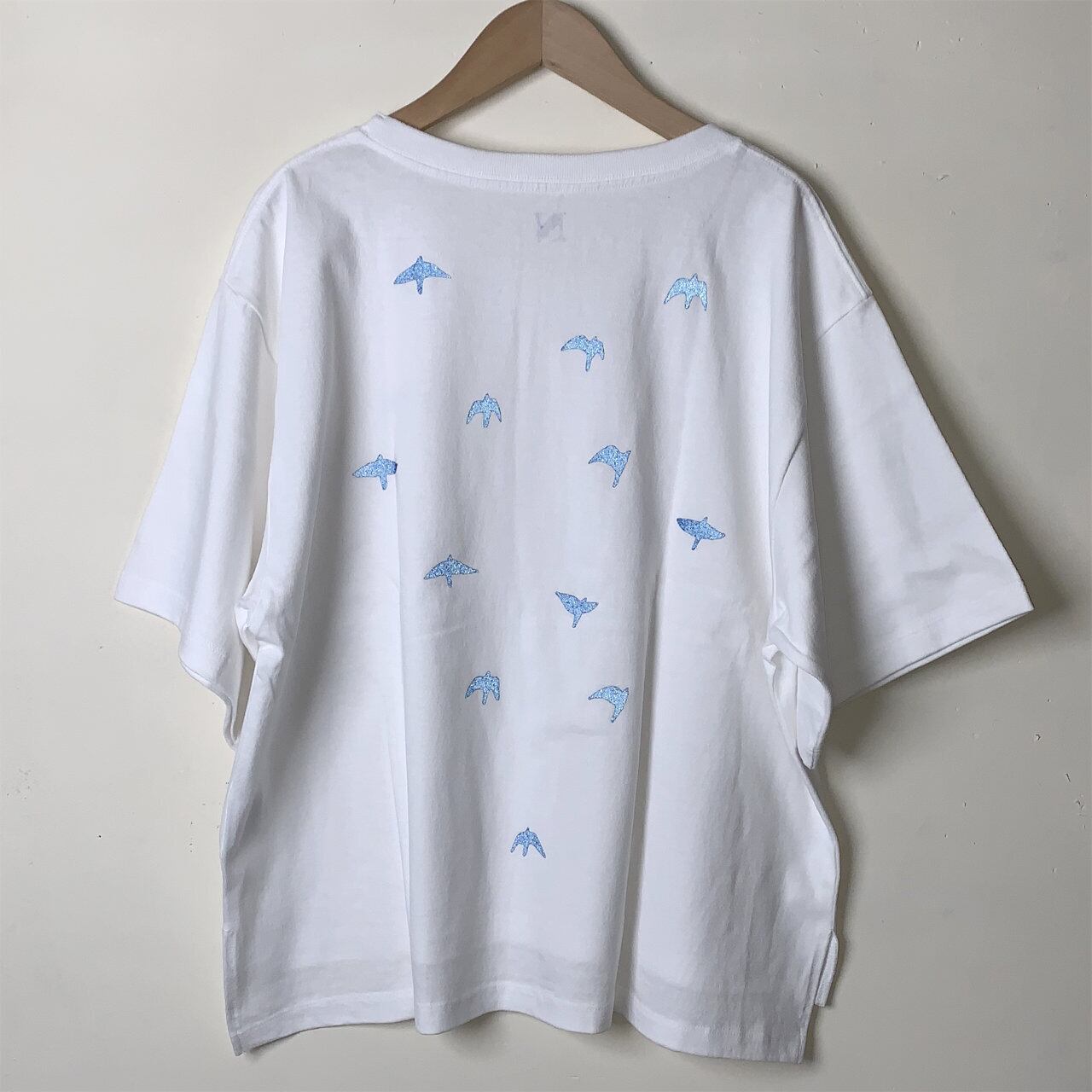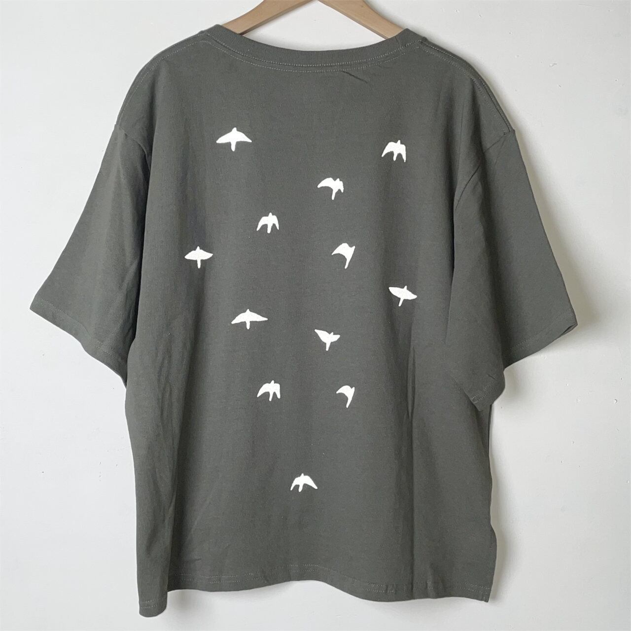 前面に1羽、背中に12羽の鳥を反射する黒インクでシルクスクリーンプリント。