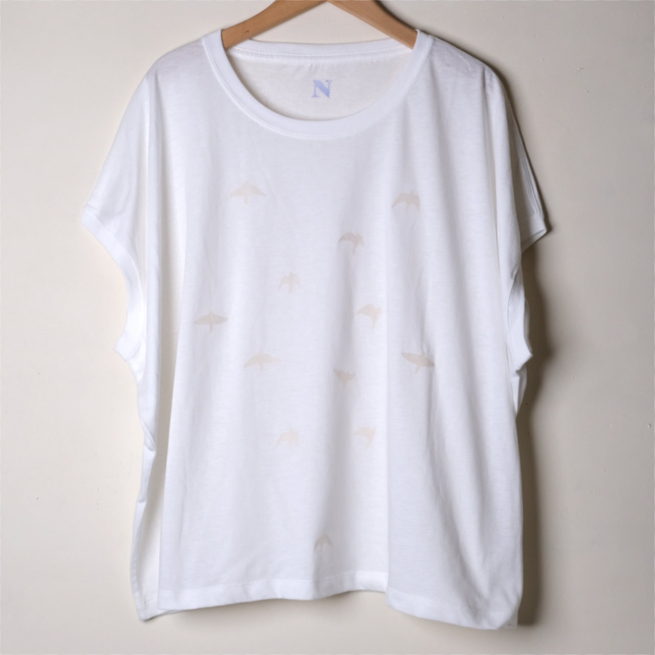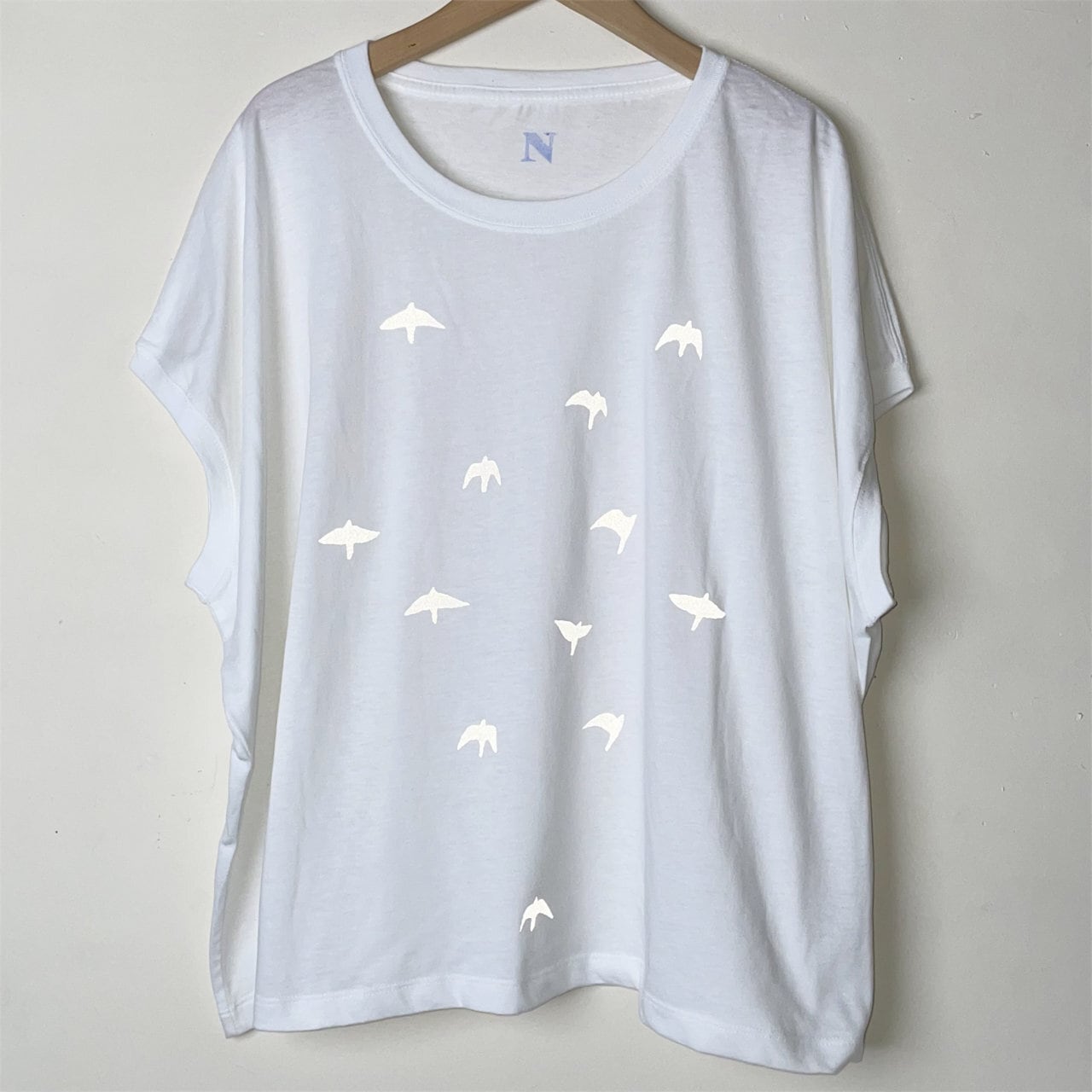 前面に12羽の鳥、背面右下にNマークを反射するインクでシルクスクリーンプリント。