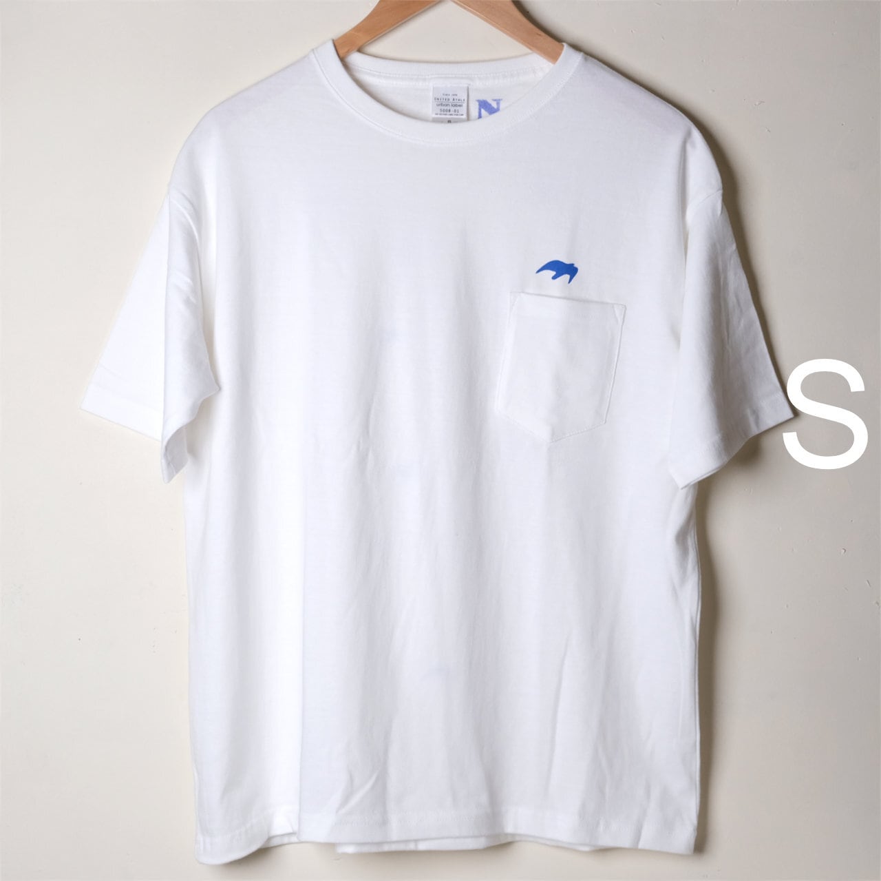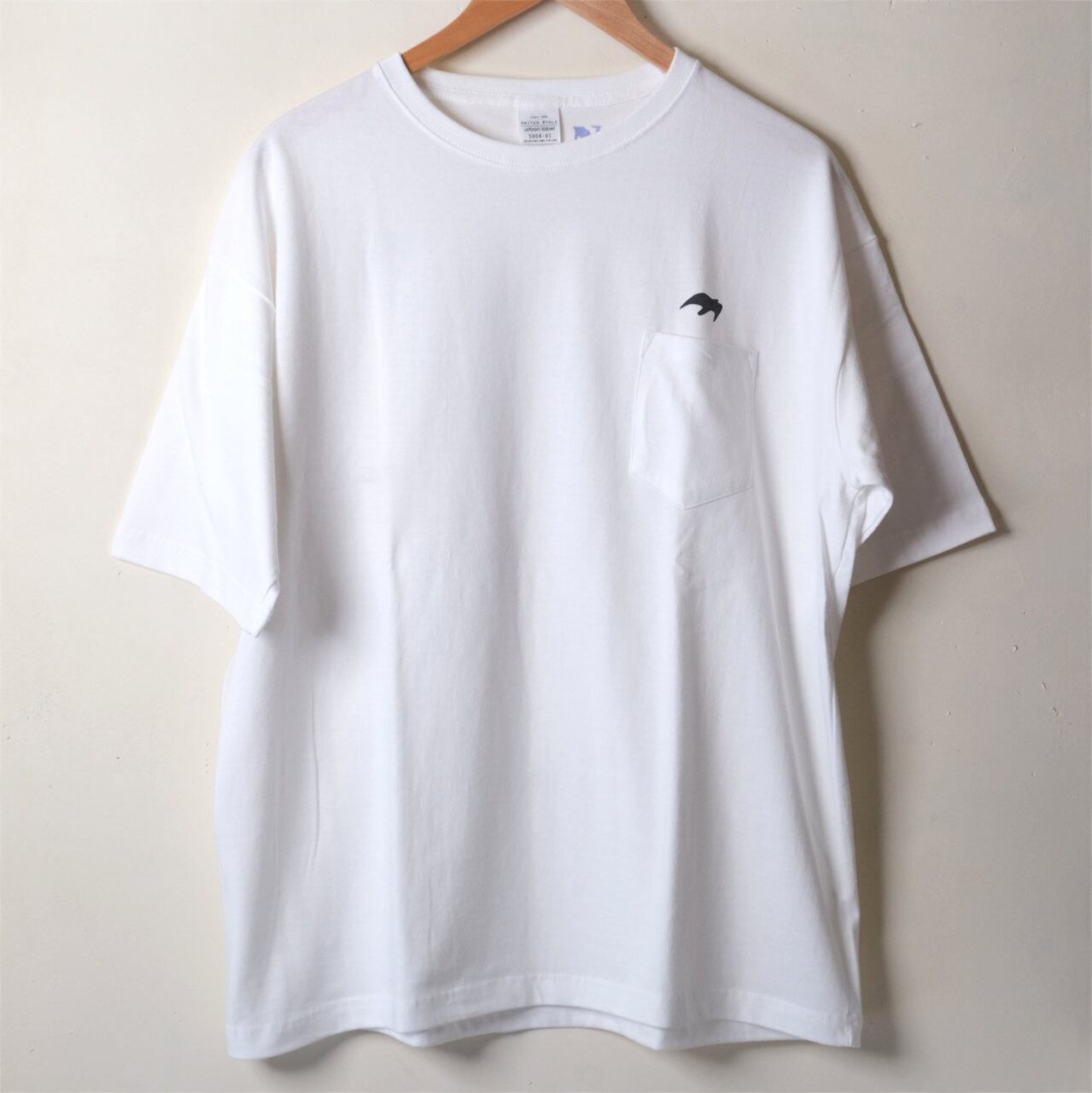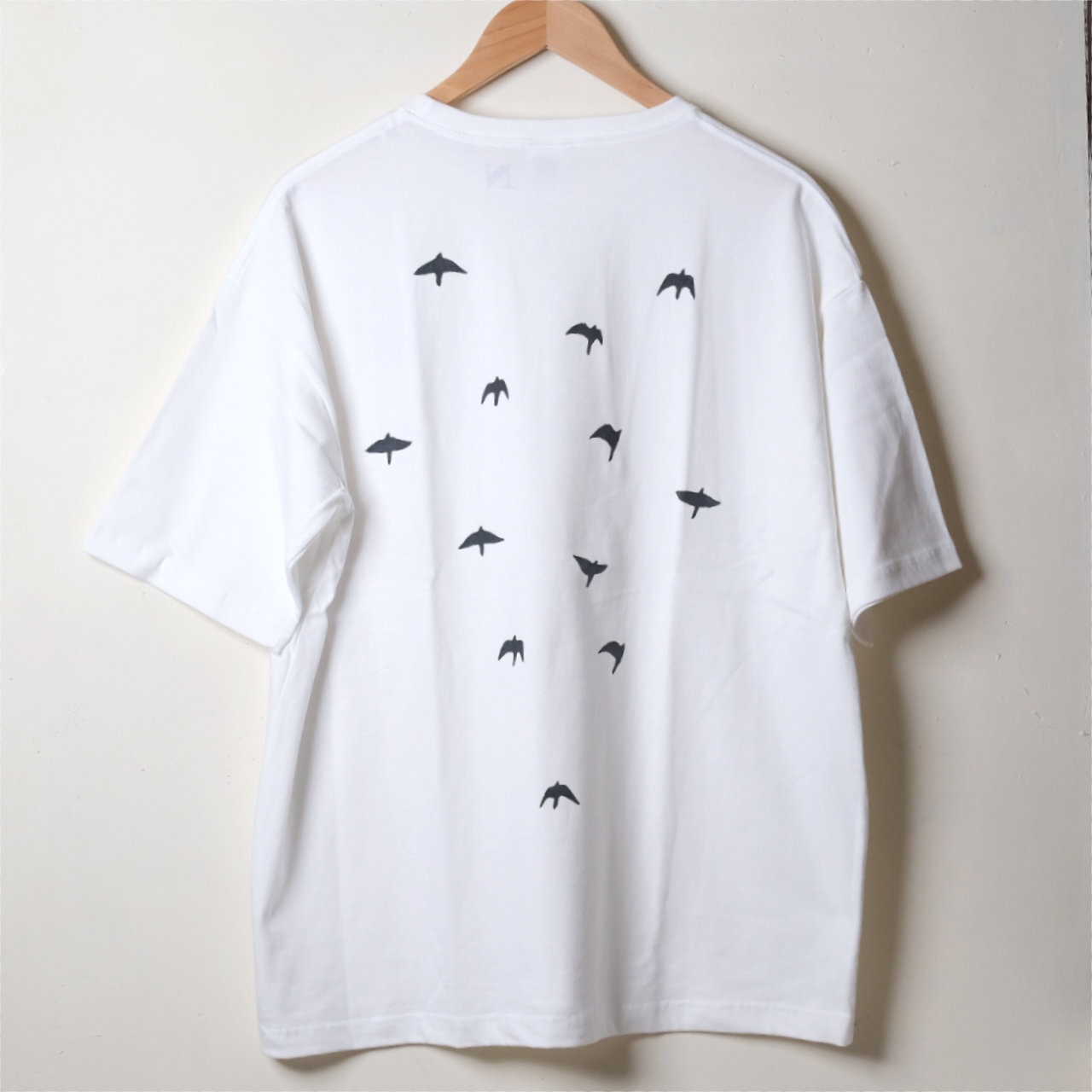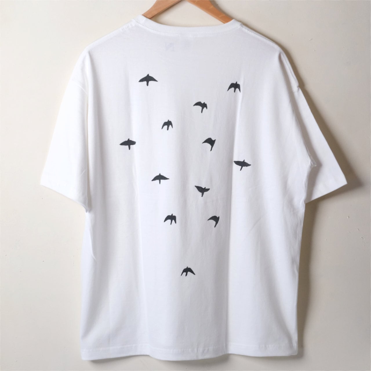 前面に1羽、背中に12羽の鳥を反射する黒インクor青インクでシルクスクリーンプリント。